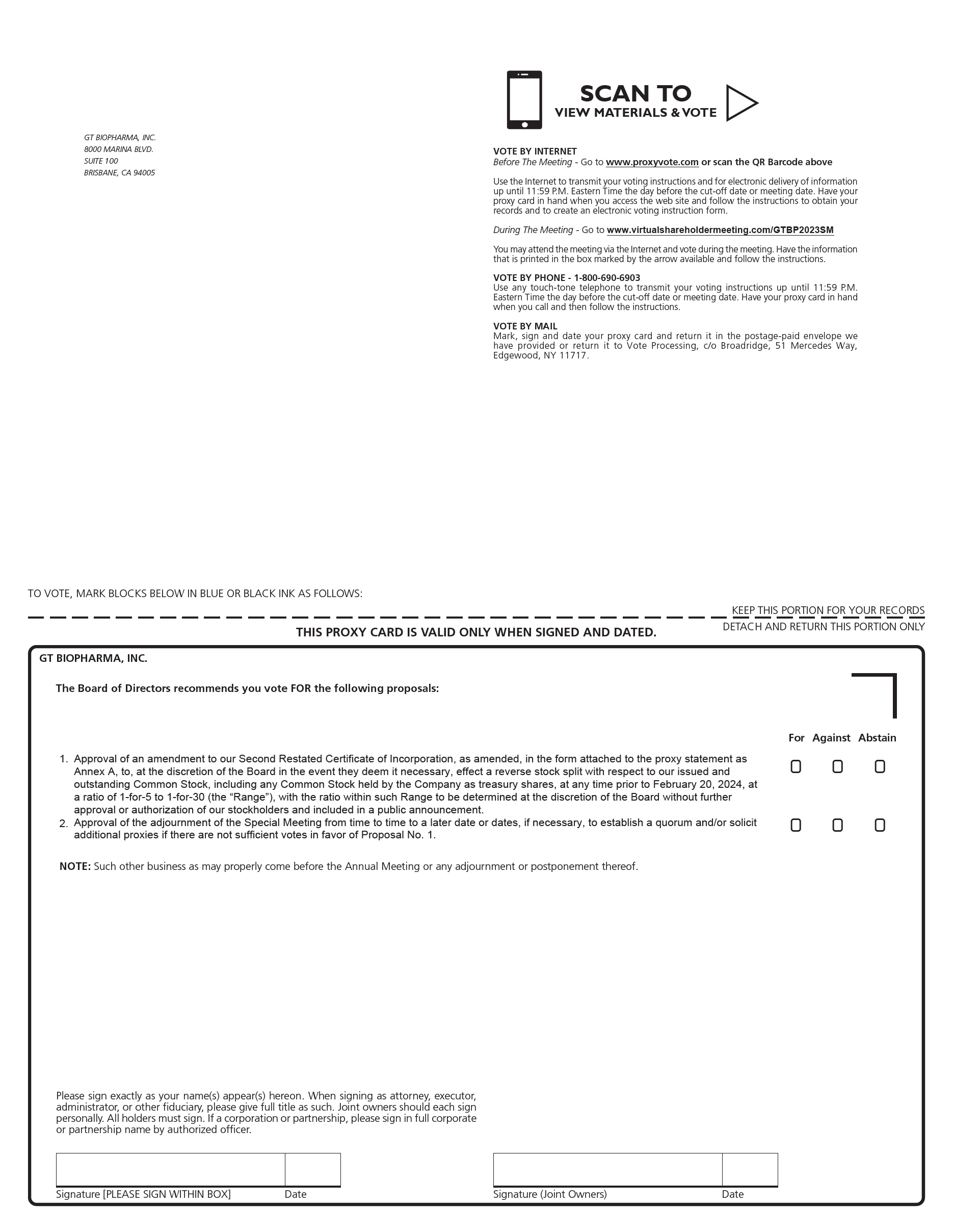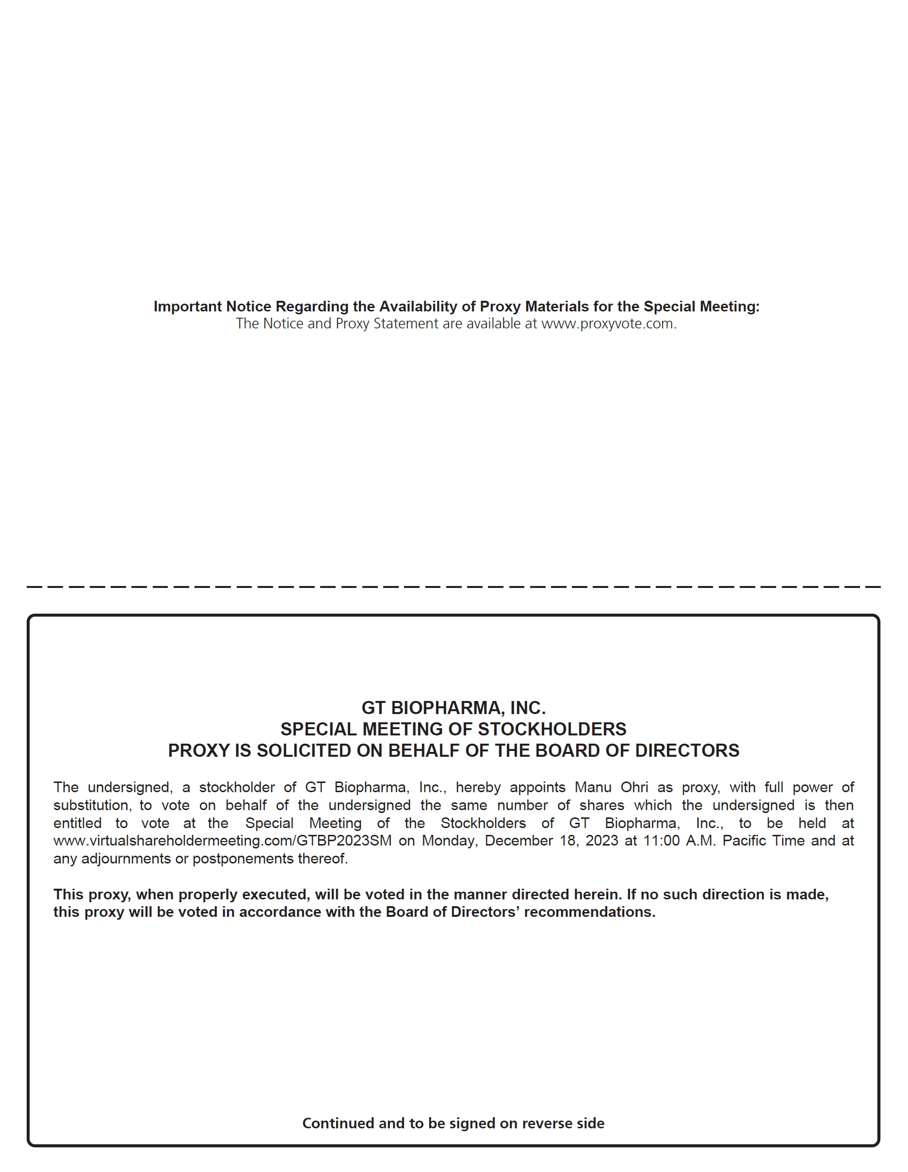 We are pleased to invite you to attend a Special Meeting of Stockholders (the “Special Meeting”) of GT Biopharma, Inc., a Delaware corporation (the “Company”). The Special Meeting will be held on December 18, 2023, at 11:00 A.M., Pacific time via live webcast. You will be able to attend the Special Meeting, vote, and submit your questions during the meeting via live webcast through the link www.virtualshareholdermeeting.com/GTBP2023SM and entering your control number, which can be found on your proxy card.