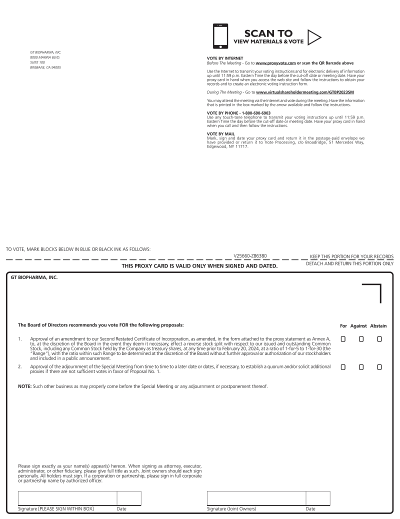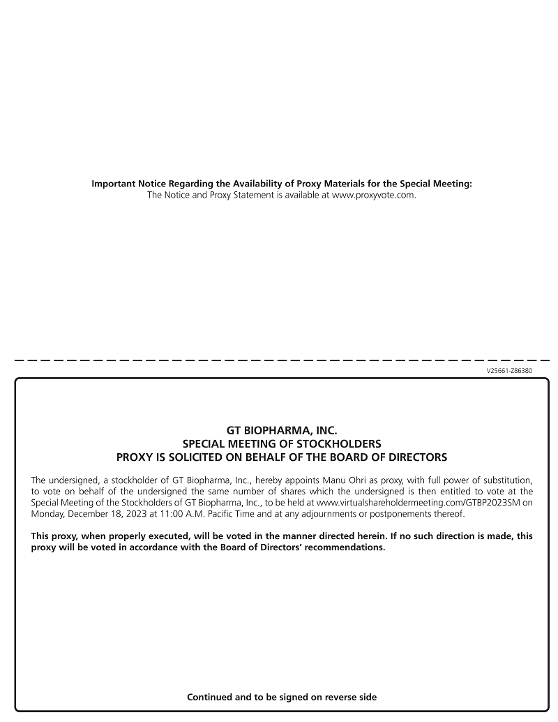We are pleased to invite you to attend a Special Meeting of Stockholders (the “Special Meeting”) of GT Biopharma, Inc., a Delaware corporation (the “Company”). The Special Meeting will be held on December 18, 2023, at 11:00 A.M., Pacific time via live webcast. You will be able to attend the Special Meeting, vote, and submit your questions during the meeting via live webcast through the link www.virtualshareholdermeeting.com/GTBP2023SM and entering your control number, which can be found on your proxy card.