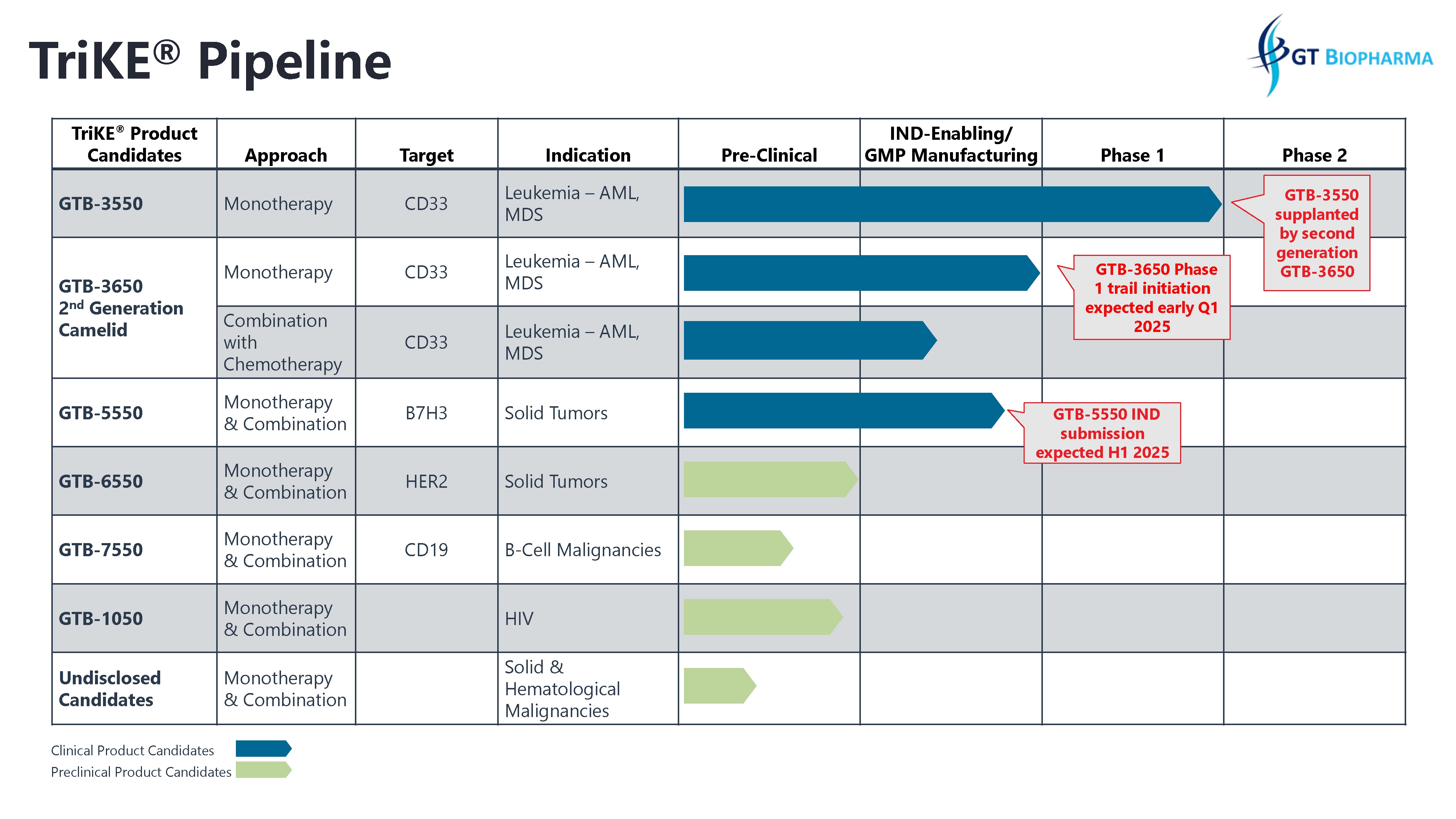 GTB-3550 was our first TriKE® product candidate and its clinical development was suspended so that we could focus resources on second-generation TriKEs®. GTB-3550 is a tri-specific killer engager (TriKE) comprised of two single-chain variable fragments (“scFv”) composed of the variable regions of the heavy and light chains of anti-CD16 and anti-CD33 antibodies and a modified form of IL-15. We studied this anti-CD16-IL-15-anti-CD33 TriKE® in CD33 positive leukemias, a marker expressed on tumor cells in acute myelogenous leukemia, or AML, and myelodysplastic syndrome, or MDS. The anti-CD33 antibody fragment in GTB-3550 was derived from the M195 humanized anti-CD33 scFv We believe the approval of the antibody-drug conjugate gemtuzumab validates the targeting of CD33.