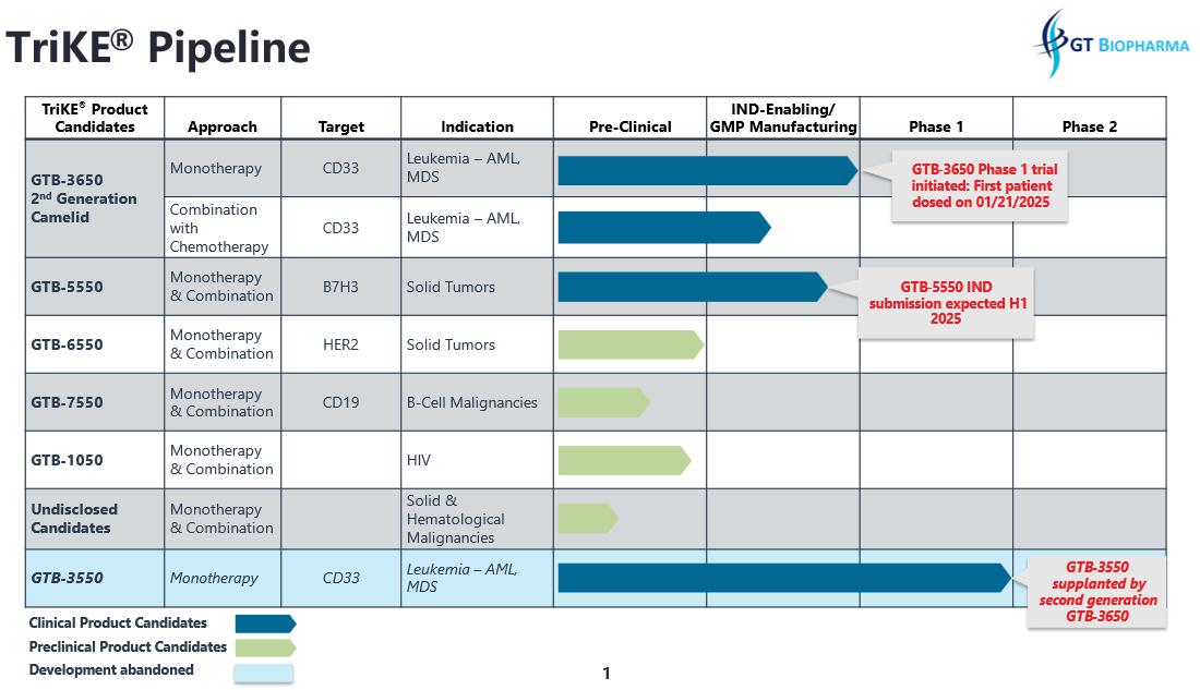 We are a clinical stage biopharmaceutical company focused on the development and commercialization of novel immuno-oncology products based on our proprietary Tri-specific Killer Engager (TriKE®), and Tetra-specific Killer Engager (Dual Targeting TriKE®) fusion protein immune cell engager technology platforms. Our TriKE® and Dual Targeting TriKE® platforms generate proprietary therapeutics designed to harness and enhance the cancer killing abilities of a patient’s own natural killer cells, or NK cells. Once bound to an NK cell, our moieties are designed to activate the NK cell to direct it to one or more specifically targeted proteins expressed on a specific type of cancer cell or virus infected cell, resulting in the targeted cell’s death. TriKE®s can be designed to target any number of tumor antigens, including B7-H3, HER2, CD33 and PDL1, on hematologic malignancies or solid tumors and do not require patient-specific customization. We believe our TriKE® and Dual Targeting TriKE® platforms that activate endogenous NK cells are potentially safer than T-cell immunotherapy because there is less cytokine release syndrome (CRS) and fewer neurological complications. Our preclinical data suggests that this is explained by the TriKE® dependent CD16 directed IL-15 proliferation of NK cells but little effect endogenous T cells.